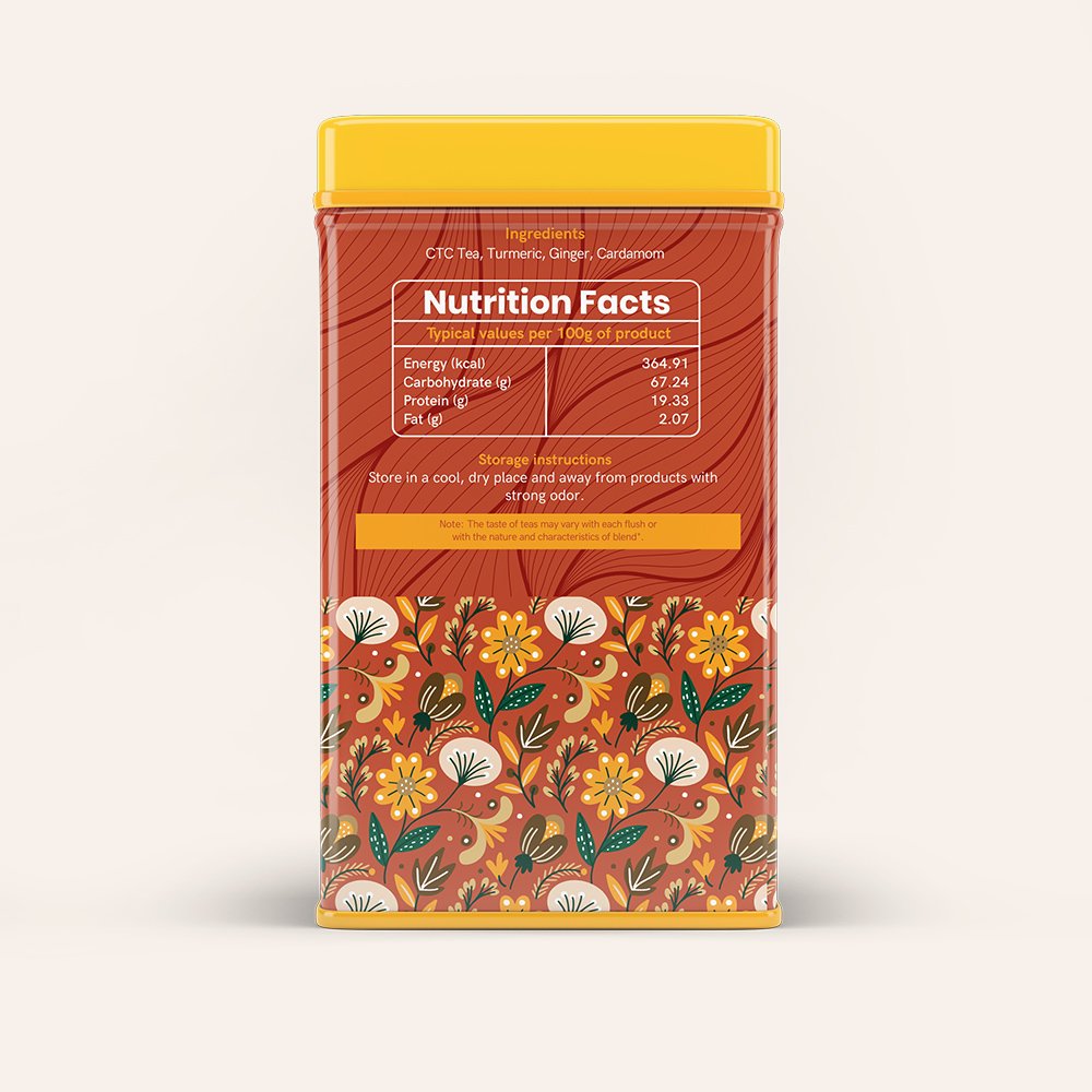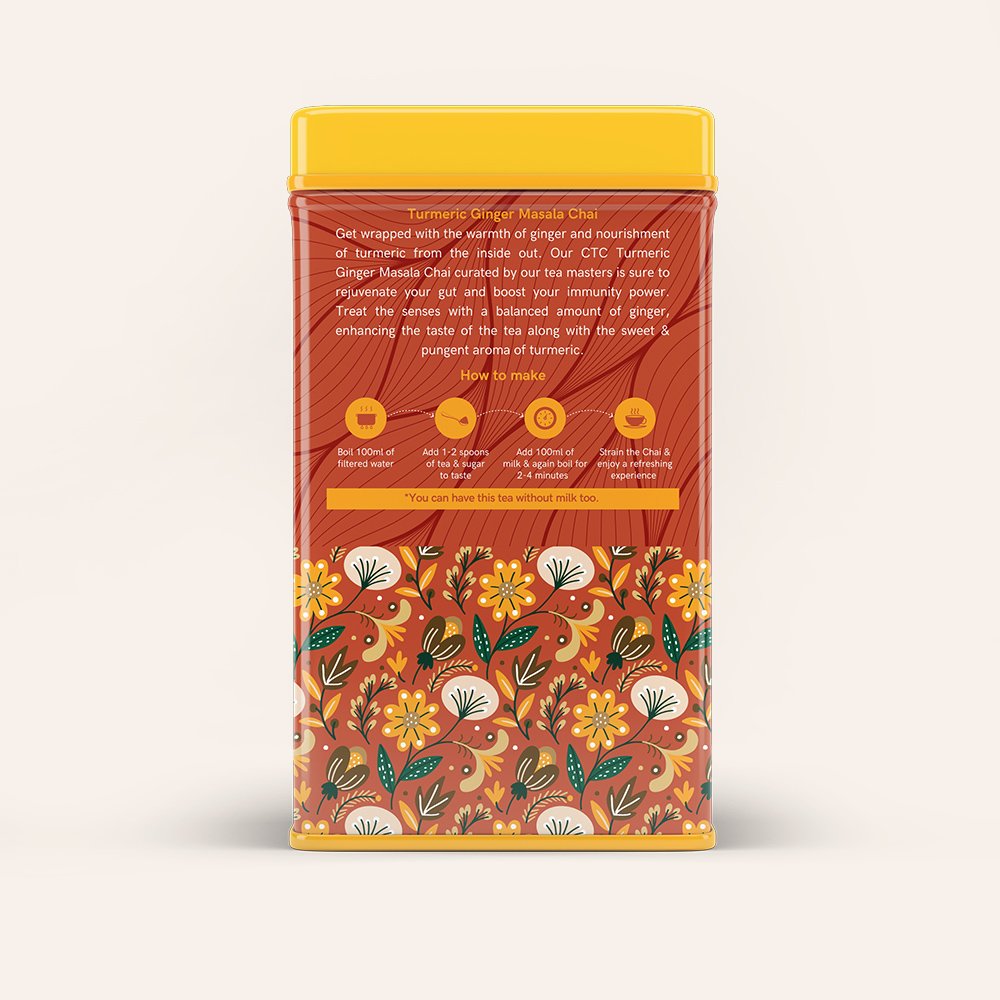 Get wrapped with the warmth of ginger and nourishment of turmeric from the inside out. Our CTC Turmeric Ginger Masala Chai curated by our tea masters is sure to rejuvenate your gut and boost your immunity power. Treat the senses with a balanced amount of ginger, enhancing the taste of the tea along with the sweet & pungent aroma of turmeric.